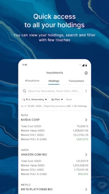• Dive into the details of your accounts(s) and portfolio information and view by asset class, product types and currency exposure.