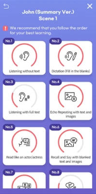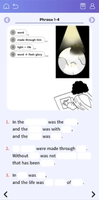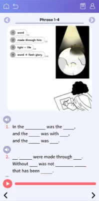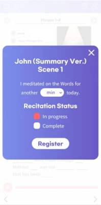 The summary version is composed of the major scenes in the Gospel of John, while the full version covers all the chapters and verses in the book. Users can follow the course of each respective version in order or choose the stages that they find most effective for themselves. The stages include activities such as listening without text, echo reading, dictation, reciting, and writing. Users can keep a record of their work and test how much they’ve learned the words of each scene or chapter any time they feel they’re ready. The test scores are never finalized and there’s always room for improvement.